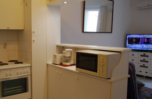 Equipped kitchen open to living room: - hotplates, oven, fridge-freezer, microwave, electric coffee maker, toaster, complete crockery.