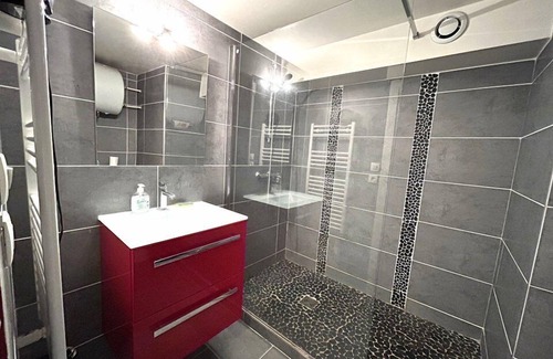 - A renovated bathroom equipped with a walk-in shower, wc and washing machine.