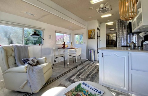 These are two separate RV’s located at Paschal Winery. The Glamp RV, otherwise known as the Glamping Cottage, features a queen-sized bed a spacious and light common area with a queen sleeper sofa, flat-screen TV, dining area, and fully appointed kitchen. The Water’s Edge RV is a brand new Cherokee RV that features a queen-sized bed, a spacious and light common area with a double sleeper sofa, flat-screen TV, dining area, and fully appointed kitchen. Both Units have their own Hot Tub.