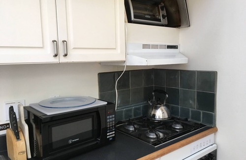 High-speed Internet and an Apple TV are hooked up to a large-screen monitor in the very comfy living room. Full kitchen with Keurig coffeemaker, microwave, toaster-oven, gas cooktop & convection oven, dishwasher. Gated garden downstairs with fishpond. (Unfortunately, this apartment is not handicapped accessible.)