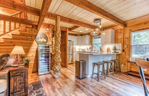 This splendid cabin is exactly what you need for your next tranquil escapade with family and friends. It's been extensively remodeled to provide you with the best lodging experience! Enjoy a nice deck area with an outdoor dining table surrounded by trees. The rustic interior offers an open floor plan that seamlessly combines all living spaces into one. A gorgeous rock wood-burning fireplace adorns the living area and is in charge of keeping you warm during the winter months. Snuggle up by the fire and stream a favorite show on the large smart TV. The kitchen adds a modern touch to the cabin with stainless steel appliances - it has everything you need to prepare tasty treats and meals for everyone. A nice den provides you with a private spot to watch TV, take naps, read your favorite books, or simply unwind. It has a laundry area with a washer/dryer. Two guest bedrooms are located on the first floor while the primary suite is on the second floor, featuring an en suite bathroom.