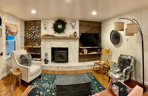 The open concept living room exudes coziness and warmth. Hand-scraped oak hardwood floors, wood accent walls, and the limewashed fireplace and wood-burning stove will make even the coldest days delightful. A 40-inch 4k smart television has Netflix, Hulu, Amazon Prime, and Apple TV apps. Just bring your favorite TV provider login and enjoy a movie night. While we think the best days are the days spent outside, we do have fast WiFi and LTE/4G coverage. The living room also features a pull-out sofa bed with a comfortable new memory foam mattress.