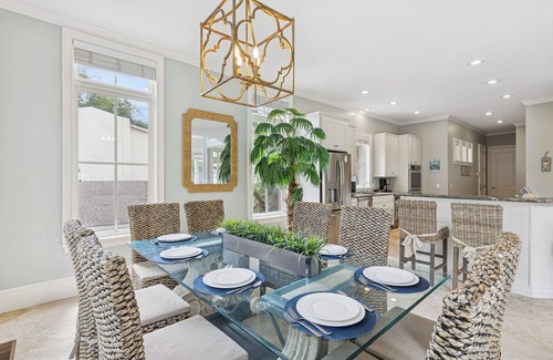 The naturally lighted living space features elegant windows with views of the private pool and spa. Gather your group with comfortable seating of two sofas, two chairs, and an ottoman. A large flat-screen Smart TV, and stylish decor make it the perfect spot to unwind after a day in the sun.