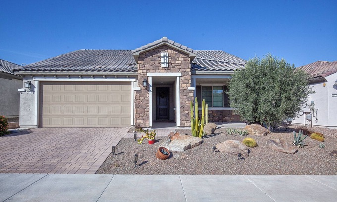{ LIMITED ACCESS FOR WEEKLY RENTALS NO ACCESS TO POOL THE AND THE JIM UNLESS YOU BOOK FOR A MONTH OR MORE} 55+ Sun City Festival community located in sunny Buckeye AZ. This is a private home just a few years young with Amenities Galore! Golf, pool, Gym, Spa, pickleball, tennis, hiking, Bocci, volley ball and more. Use of gym and pool are optional and require a guest pass that cost 100/pp paid directly to the community upon arrival. requires minimum one month stay to be eligible for community passes. Home has natural gas barbecue, fire pit, lounging, dining overhead fan private outdoors. Room in garage for your vehicle, Fully furnished home with Mountain View’s!!note: HOA requires for renters to rent a full month or longer please INQUIRE for vacancy Jan/ Feb/March/April/May. A 3 month minimum is required as this is the peak season. Inquire about a shorter stay during the months of June July, August, and September. If your stay shorter than one month consider a stay without guest passes to the amenities.