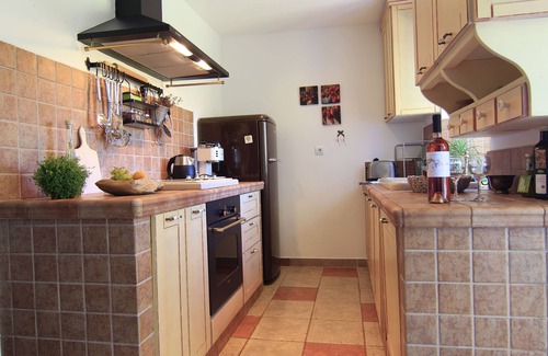 Kitchen is equipped with cooking utensils, dishwasher, microwave, espresso machine, fridge with freezer, cooker with oven, toaster and rice cooker, cattle and blender. Kitchen also has a beautiful rustic stone sink.