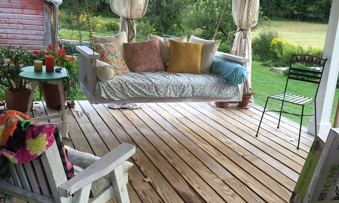 Take in the views of “the back 40” while sipping your coffee, listening to the creek and contemplating a walk through the forest up to Oscar, the second oldest oak in Vermont. Or savor a glass of wine as you watch the sunset behind the mountain and maybe plan a hike to the Northwest corner, where there is an old post marking the NY/VT state boundary. (Our property backs up to 800 acres of state forest and mountains.) Either way be sure to take a rest and take in the breath taking views at “The Fork” on your way up.