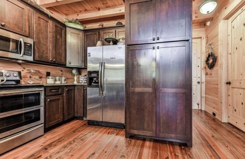 If someone in your party is handicapped or has trouble with stairs the main floor is on one level (including the deck, kitchen, dining room, living room, bedroom, bathroom with walk-in shower, 2 65" TVs, and two large fireplaces.) There are just 3 steps to access the home. The cabin has been lovingly appointed with elegant, rustic décor. Every piece of furniture was selected for comfort and style. Oversize windows bring in beautiful forest views and natural light.