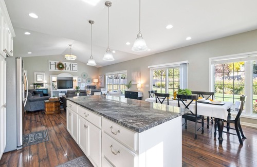 Designed to impress! You will love the Open Concept/Cathedral Ceiling Living Room & Dream Kitchen with 9 foot island and 2 separate dining tables. Overflow mini room with small table - perfect to escape and use your laptop or enjoy a glass of wine. Whether chatting, eating, watching tv, or playing games everyone can gather together in one huge open space in our amazing home.