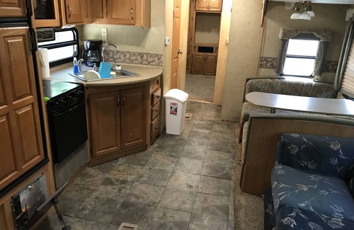 Trailers name is Lucille after our favorite comedian from her movie the Long Long Trailer. The rear room has has two slideouts with four four twin beds with an entertainment center and plenty of storage room for vacation toys. Main bedroom has a pillow top Queen size mattress. Living room/Dinning room slide out for plenty of room to visit with multiple gusets or just to lounge about. Kitchen has counter space with enough room to cook a meal if not outdoor cooking") Dish ready. Lucille also has a wet bar for those who want a refreshments once set up at your desired oasis")