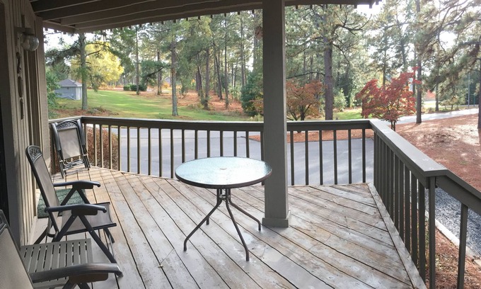 Vacation in Foxfire Village, Golf Front Condo at Foxfire Golf Resort across from the Foxfire Village Swimming Pool, Deck Views of the 17th Fairway on the Red Fox West Course, Main level 2 Bedroom 2 Bath Condo, sleeps 6, just 9 minutes from historic Pinehurst and Southern Pines, NC. Fully Furnished with Large Flat Screen TV in the living room and master bedroom, spectrum Cable Standard Package of 77+ channels, and of course, WIFI, front and back decks overlooking the golf course and swimming pool area. There are two large bedrooms, and two full bathrooms, 4 sliding glass patio doors for easy access from each bedroom to the private decks, lots of natural sunlight, two separate bathroom vanity areas with large mirrors and double bowl sinks. All Appliances: Full Size Refrigerator, Oven/Range, Microwave, Dishwasher, Large Stackable Washer/Dryer inside the unit. This is a newer, more contemporary style condominium complex built in 1990. Nice furniture and Linens, light beige carpeting and recently painted. Your host for this property is Christine Batson for anything you may need. Easy, anytime entry access by Combo Lock Box, Extra keys inside for extra guests! Swimming Pool passes are available upon request. Cost to swim is $3.00 per person per day. Golf reservations must be made through Foxfire Golf Resort & Country Club . Village Green Park is located on S Shamrock Dr, and has a playground, shuffleboard, covered shelters, and miles of walking trails.