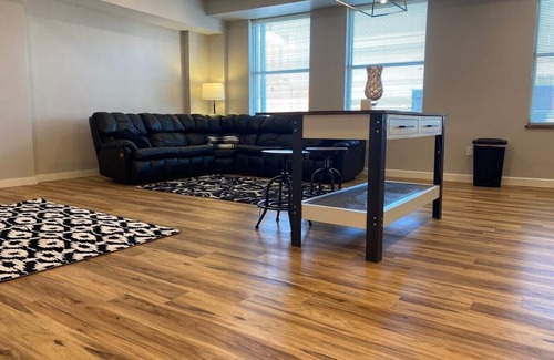Brand new-downtown apartment. This entire building has been completely remodeled. Enjoy down-town living. Walking distance to bars and restaurants. Very spacious open concept living area. Features a leather sectional/sleeper sofa, smart tv (must have your own login for streaming). Unlimited WiFi, washer & dryer, kitchen appliances include refrigerator with built in ice maker, microwave, stove & oven. Small island that has seating for two.