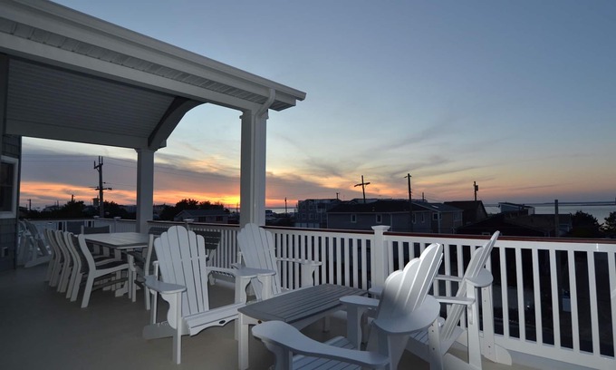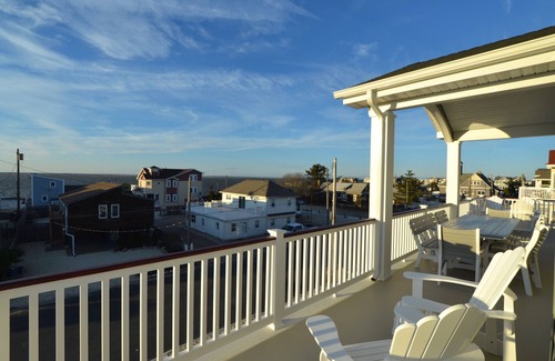 Wide lot, quiet small block, 42’ veranda with sweeping bay vista, and two-level roof deck with end-of-island water panorama, from bay facing east -- Forsythe beach surf and AC to the south -- over ocean to horizon in the east.