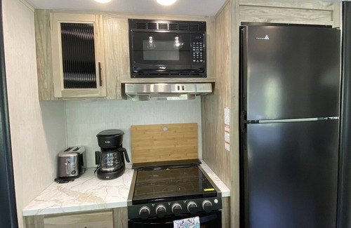 The living area has a large pantry, full kitchen with refrigerator, freezer, 3 burner gas stovetop, oven, sink, microwave, coffee maker, toaster and blender.