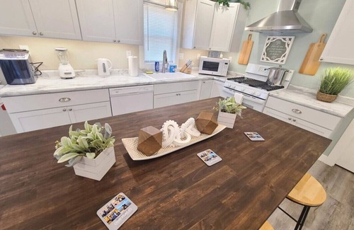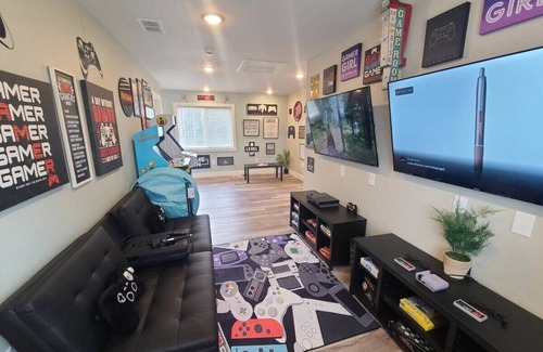 50' Lake frontage accessed just across road. We own 2 other homes next door and each home has a 50' Lake Access and Beach. With 4 bedrooms, 7 beds and a futon, there's plenty of room for relaxing. Each bedroom has its own theme and all beds have quality memory foam mattresses. The upstairs bathroom is the larger of the 2 full bathrooms and offers a full shower /tub setup with a separate water closet to allow for others to get ready to go out or prepare for bed. The main floor is a true open concept that allows not only the fresh air to easily flow through the home but allows your group this same luxury. We've added a large 35' long deck off the back of the home that stretches the entire length of the home. From the deck you'll be able to enjoy your group relaxing by the firepit or grab a chair and watch the large variety of birds, frogs, turtles, ducks, deer and more. We upgraded the game room on this home to offer a larger space to enjoy during early mornings or evenings when you're not swimming/fishing. Driving an electric vehicle..? We have a level 2, 50 amp car charging station on the driveway side of the home for convenient charging. This home has 10 parking spots.
