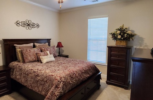 Custom 4/3.5 one story home in beautiful River North community. It features a very open floor plan with large LED Smart TVs in every room. Living room has 2 recliners and 2 sofas that have an additional 2 recliners on each end. The master bedroom has a king bed, and the other two bedrooms have queen beds. The 4th bedroom/office has a day bed that can convert to a king bed. There is also a twin XL rollaway bed available. There is an oversize driveway for additional parking with inground basketball hoop. In the backyard is a large canopy with 6 chairs surrounding a fire pit. Beside it is a 16x33 inground heated pool. The back porch has a comfortable conversation set with an additional dining set to enjoy the BBQ grill.