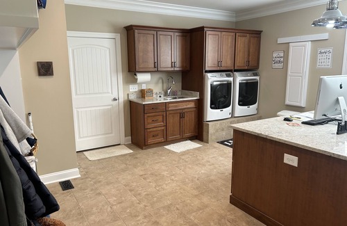 This brand new house has 4 bedrooms - each with its own full bathroom, ceiling fan and brand new Smart TV. This spacious and immaculate home is laid out on two levels providing all the amenities of home. The main floor has hardwoodd throughout! The master bedroom located on the main floor, with amazing views of the lake, has a king size bed, a walk-in closet and a master bathroom with a double vanity, Kohler clawfoot tub, walk-in-shower and a private commode. The other two bedrooms on the main floor have queen beds, Smart TV's and ensuite private attached bathroom. The second master bedroom on the lower level has a king size bed, Smart TV and ensuite private attached bathroom. All bedding in the house is new as of August 2023. The main floor living room offers a brand new 75" Smart TV and gas fireplace. The lower level of the home also includes a rec room that includes a beautiful 8 foot slate pool table. Spectacular views of the lake off the upper level of the screened-in porch are the highlight of this beautiful home along with the lower level covered patio that is an inviting place to grill and dine on the eight (8) seat patio table. Between the firepit area and dock, there are eight (8) adirondack chairs available to sit and enjoy your morning coffee or a refreshing cocktail while providing a beautiful and peaceful view of the lake. The home also has a multipurpose room located off the living area that includes a large island that is used as an office area and includes a brand new washer and dryer set. There are six (6) Smart TV's in the house along with FREE wifi among the amenities offered.