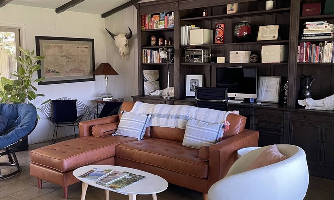 This house sleeps 8 in beds. It’s a 3 bedroom 3.5 bathroom mid century modern house has a great open concept on the Benbow green. The kitchen has been upgraded, there are 2 living rooms, a beautiful dining room, two patio spaces and plenty of paved parking. It is located on the Golf course and is a swing away from the Benbow Inn restaurant and bar. The hot tub is brand new. The pool is salt water. There is extensive outdoor dining with a fire pit and Bbq. All the linens and bath are luxury quality. Come book with us!!