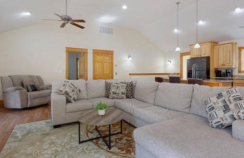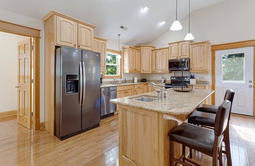 The Top Level of Big Guppy is designed for relaxation and entertaining. The fully-equipped Kitchen makes meal preparation a breeze, while the spacious Living Area, complete with a gas fireplace, invites cozy gatherings. Enjoy meals as a family in the Dining Area, or take advantage of the Screened-In Porch and furnished Sun Deck to dine al fresco with beautiful views. The King Master Bedroom on this level, featuring a Private Bathroom, provides a serene retreat, while a convenient Half Bathroom is available with ease of access for the rest of the family during your stay. Take the Elevator between floors for easy access and a relaxing, rejuvenating stay.