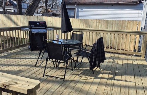 Escape to a charming 3-bedroom home in Gary. Unwind in the soft earth tone soothing bedroom colors featuring 1 king bed and 2 queen beds. With 2 bathrooms equipped with hair dryers. This amazing property also offers additional spaces like a cozy living room with 2 sofa beds and an office with a futon. Play cards games like uno or spades,dominos, and shoot pool or play table tennis with your guest. Enjoy a large walk out deck with luxurious lighting and funiture to have a smoke or enjoy a dining out experience under the moon light with family and friends. A great place to call homebase while you're away, we know you will enjoy your stay.