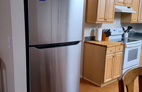 The kitchen has all the modern conveniences including a dishwasher with soap, microwave, electric stove top and oven, Butcher block counter and other cutting boards, Instant Pot, Blender with multiple bullets, Rice Cooker, Crock Pot, Coffee Pot with Coffee and filters, Electric Water boiler, Toaster, Fully stocked Pots and Pans, dishes, glasses, mugs, and utensils. An assortment of spices is also available.