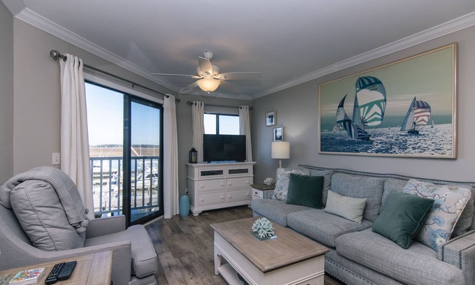 - Golf course adjacent, beach-themed condo with sunroom, washer/dryer, & AC