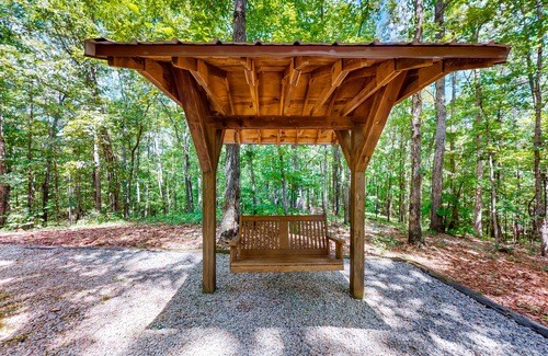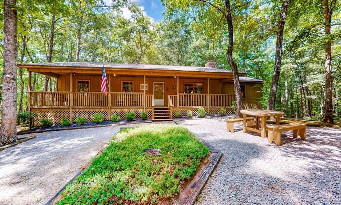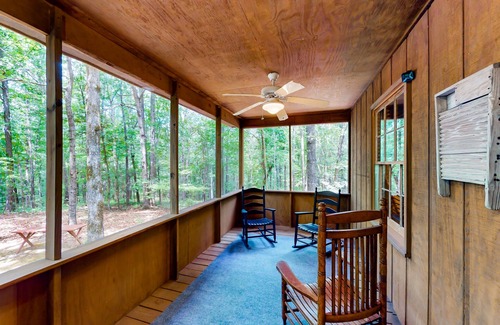 Immerse yourself in the splendor of Western Georgia while embracing the slower pace of country life at this woodsy retreat. Tucked away on a 24-acre lot, this scenic escape offers a serene sanctuary for you and your guests. Multiple outdoor spaces are designed to take advantage of your surroundings, with highlights including a screened deck, a furnished front porch, and a large picnic gazebo for enjoying alfresco family feasts. A covered swinging bench offers a quiet spot to kick back beneath the trees. Walk along the rippling creek and explore the trails around the property while searching for signs of wildlife. A rustic, wood-burning firepit sets the stage for starlight s'mores with family and friends.