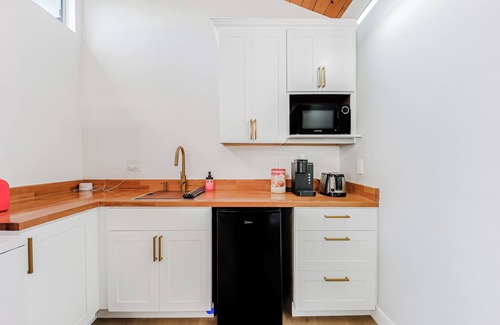 The studio has a private kitchenette and wet bar with a microwave, toaster, water kettle, fridge, and amenities.