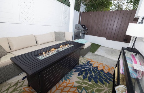 The private outdoor covered patio room area is attached to the unit and is private. It features a sectional couch, firepit, console table and BBQ. It is very nice. This area has everything needed to enjoy the space year round....the best in California indoor –outdoor living.