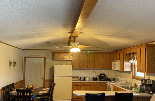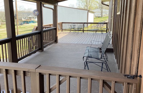 Small lake community with open views. Nice area for walks and children to play. Plenty of room for parking and bbqing. Closed in porch with 2 locking gates. Table and chairs for outside relaxing. Plenty of room for air mattresses if you need more sleeping space. There is a 220 plug for camper parking, nothing over 20 ft. Flat space is limited. 5 min walk to lake, boat launch, 5 min boat ride to Fout's Marina. Creeks nearby for cooling off and a different scenery.