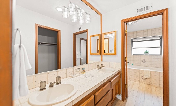 Each bedroom is thoughtfully furnished, with two featuring California king beds and the third offering a queen. The home also includes soaker tubs for a calming end to the day, and a sleeper sofa for additional guests. Ceiling fans throughout help keep the air fresh and comfortable.