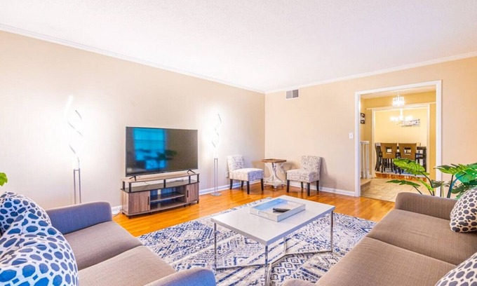 This home features 2 living rooms, each equipped with 55" smart TV's for streaming Netflix, Youtube and more! Rec room has a full competition sized ping pong table as well as various games for all to enjoy. All cookware and utensils included in the kitchen for you to make your own meals. For your peace of mind, all sheets, pillowcases, and towels are washed prior to your stay. Enhanced cleaning protocols are in place to protect against COVID-19. You can rest easy knowing you're in good hands. Please unwind and relax in this beautiful home for vacation or for work.