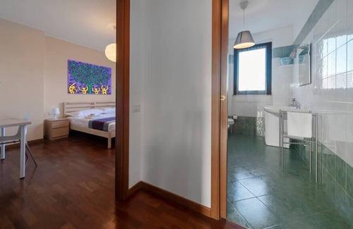 Casa da Suite Dinamica is located on the third floor of a modern and elegant building, equipped with a lift and concierge. The apartment has a large living area, with kitchen (equipped with stove, oven, dishwasher and microwave), dining area and double sofa bed, a bathroom with shower and washing machine, a double bedroom with desk and wardrobe and a large balcony overlooking the gardens below. This modern apartment has the most advanced heating system (floor centralized heating), air conditioning in every room, unlimited wifi fiber optic connection, smart TV. The house guarantees maximum privacy to its guests: with rooms soundproofing, double glazed windows and security entrance door. For those who travel by car: a double garage is always available (accessible directly by lift), which can accommodate up to two cars at the same time.