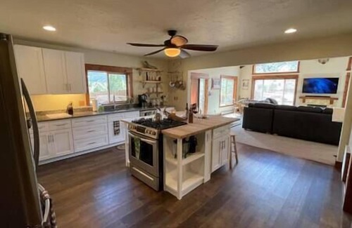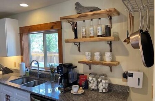 Our fully equipped kitchen includes the latest in modern appliances, granite and butcher block countertops, a farmhouse-style sink, and a comprehensive selection of cookware. Whether you're preparing a homemade breakfast before a day of adventure or savoring a romantic dinner for two, our kitchen and outdoor gas grill will meet your culinary needs.