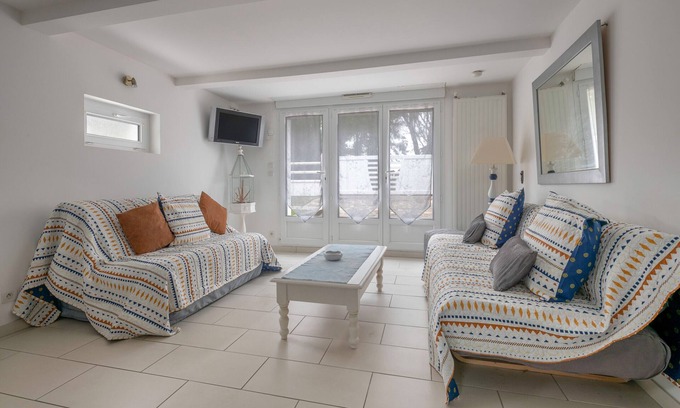 Choose the ideal destination for a holiday or extended weekend with multiple activities. With family or friends, pack your bikes, flip-flops, and towels to visit southern Brittany. Cross the longest bridge in France to discover the 43 km of coastline on the Jade Coast. Let yourself be guided by the cooking smell of the famous "Saint-Michel Galettes" and drop your luggage in the city most famous for its biscuits, Saint Michel-Chef-Chef.Located around the Bois Roy area and its health trail, and just a few steps from the sea, beaches, and the town of Saint-Michel (church, markets, delicatessen, bakery, cinema, biscuit factory, pharmacy, post office, supermarket, press café bar and restaurants).This ground floor apartment of 65m² consists of a living area with a TV lounge space and an open kitchen equipped with all necessary household appliances to make you feel at home (ceramic hob, oven, fridge-freezer, microwave, filter coffee maker, toaster, kettle). On the sleeping side, you will have 2 double bedrooms (2x140) and a baby bed. A bathroom and separate toilet equipped with a washing machine complete the rental.For maximum comfort, you can secure your bikes or park 1 car on the enclosed ground, and additional free public parking spaces are available in front of the house. A charcoal barbecue and garden furniture are provided.This rental is located less than 100m from the sea, and also:- 100 m from the Vélocéan route and cycle paths- 200 m from the Redois fishing beach- 400 m from shops (market, delicatessen, bakery, cinema, biscuit factory, pharmacy, post office, supermarket, press café bar)- 500 m from "Bicyclock"- 600 m from "L'Atelier St Michel Chef Chef et Café"- 700 m from the first 22.1kW charging point- 900 m from "Gohaud Beach" and "Tharon Main Beach"- 1 km from Super U & Drive- 2 km from Tharon-Plage Centre, its carousel, shops and night markets- 2.4 km from "Racing Kart Jade" circuit- 3 km from Gâtineaux Pond- 8 km from La Plaine sur Mer and its shellfish area- 10 km from Saint Brévin les pins, its beaches, casino and commercial zone (Hypermarket, cinema, bowling, fitness centre, organic shops, escape game) and "Aqua Jade"- 9 km from "Saint-Nazaire Bridge" and the largest Quad circuit in the region "Quand St Brévin"- 16 km from wake park and cable ski "TSN44" in Saint Viaud- 18 km from "Défi Nature", Château de la Rousselière park in Frossay- 20 km from Pornic historic centre (shops, markets, craftsmen and earthenware)- 23 km from "Pornic Ria" (garden, casino, kayaking on "Le Canal de Haute Perche") and "Pornic SNCF Station"- 55 km from "Nantes Atlantique Airport"This rental benefits from a concierge service and a team available throughout your stay for personalised services.Set sail for the Jade Coast, uncover pirate mysteries and the story of Chef Chevecier, former guardian of Church property, who reportedly resided in a chieftaincy in Saint-Michel. It was then called Saint-Michel du Chevecier Chef. This name gradually became Saint-Michel Chef Chef... With its 4.5 km of fine sand and family-friendly beaches, surfers, foot fishing enthusiasts, bodyboarders, paragliders and kite flyers will find their favourite spot between "Tharon Main Beach" and "Roussellerie Beach". Take the opportunity for a trip to Pornic for a day's sailing excursion to nearby islands or, depending on the tides, try some foot fishing or fishing in fish traps. Foodies, don't leave without tasting all local specialities like the unique Bouchot Mussels from La Plaine sur Mer, famous Fraiseraie ice creams and jams, delicious "St-Michel" Galettes an