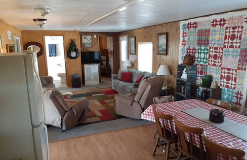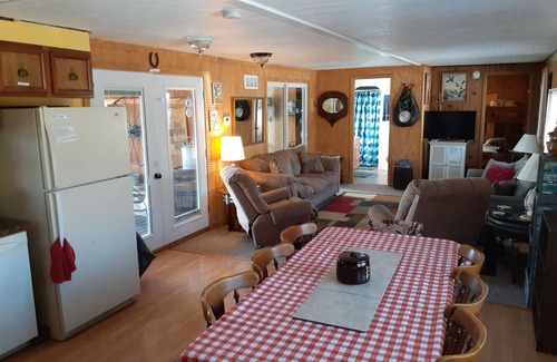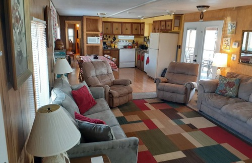 Water's Edge Cabin is right on the water with its' own private boat dock/swim platform. It is a three bedroom cabin with 2 full bathrooms. The great room and kitchen are "open concept". The master suite has a king size bed with its' own bath, jetted tub and shower. The other side of the house is devoted to a bedroom with a king size bed, which overlooks the water, then the other bedroom has 4 twin beds. These 2 bedrooms share a full size bathroom. The great room/kitchen area leads out to the screened in porch which runs across the entire length of the back of the house, which is over the water. From the screened in porch, there is a "sunning area", then our gas grill complete with propane and also our fire pit, which we supply plenty of split firewood and firewood starter cubes. The gangplank leads down to Water's Edge's boat dock/swim platform. We have free Roku T.V. and free Wi-Fi.