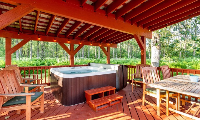 Forest side guest cottage. Perfect for 2 couples and 1-2 kids/teens. On the same acreage as owners’ home, with private parking and entrance on opposite side of property. Exclusive use of hot tub in backyard.