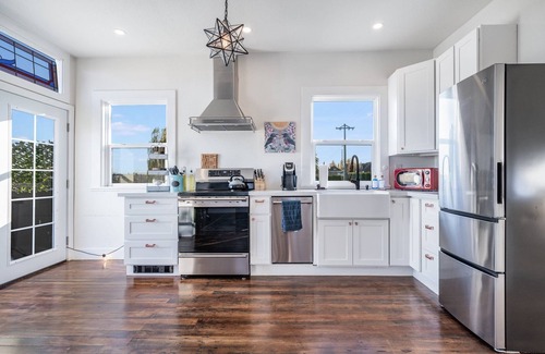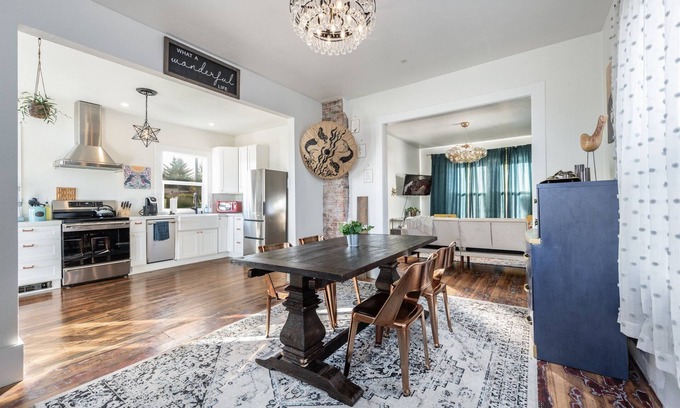 The primary floor boasts a stunning living area adorned with designer light fixtures, a dining space seamlessly connected to the kitchen, and lofty vaulted ceilings that create a sense of spaciousness. Abundant natural light bathes the interiors from dawn till dusk, rendering the residence exceptionally luminous. Ascending the original 1908 staircase, two snug chambers await, each with its unique character - The Crow Room, exuding an intimate and moody ambiance, and The Hummingbird Room, a romantically adorned space with exposed brick accents. The bathroom is a gem with a "wet room" concept, combining a beautifully tiled shower and bath, personally cherished as one of the home's highlights. It's equipped with a bathroom fan that incorporates a Bluetooth speaker. In April 2023, brand-new organic mattresses were added, accompanied by soft sheets, snug blankets, and an assortment of pillows to cater to individual preferences.