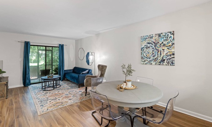Posh Pad is the perfect haven for both vacationers and temporary workers seeking comfort and convenience in Savannah, GA. This stylish 2-bedroom, 2-bath condo is situated in a quiet residential area within a serene complex. The open-concept living area provides ample space for relaxation and entertaining, while the fully equipped kitchen makes meal preparation a breeze. Unwind on the private screened-in porch, ideal for morning coffee or evening wine. Each bedroom features a cozy queen bed for a restful night's sleep. Modern amenities, including a smart TV, high-speed Wi-Fi, and in-unit washer and dryer, ensure all your needs are met. With access to community amenities like a pool, yard, and free parking, Posh Pad offers the perfect blend of comfort and convenience for your stay. Botanical Boho offers all-inclusive utilities (internet, electric, water, sewer, trash, and pest control), ensuring a hassle-free stay.