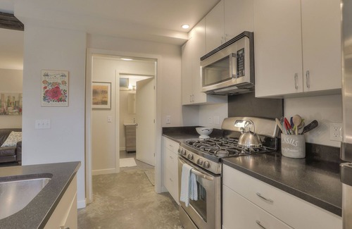 Quiet unit with all HEATED polished concrete FLOORS and two stylish bathrooms. Gourmet kitchen with gas range and stone counters. Eight foot ceilings throughout apartment. Master bedroom has king bed & its own bathroom with tile shower. Hall bathroom has shower. Hide-a-bed couch that is brand new and has fold out memory foam mattress. TV now new larger one. Apartment has had extensive soundproofing so you are comfortable. Owner is builder.