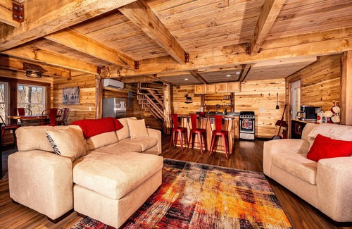 Upon arrival, you will notice a restful feeling as you drink in nature’s bounty, nestled amongst the tree tops as you climbs the stairs to enter the front door. Entering the first floor, you will find a cozy living room with an electric fireplace. Snuggle up by the fire and watch a DVD movie on the 55" smart TV or just admire the wood interior around you.