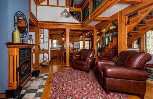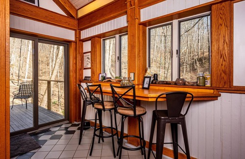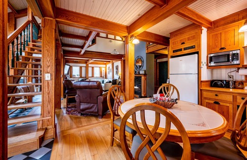 The living room with 65" smart TV with high definition antenna, dining area, and kitchen share a common space, which makes it nice when cooking and visiting with your companions. Here is where you’ll gather to socialize, watch TV, or cuddle up in front of wood fireplace with logs a-blazin’. There is a sitting area of all windows for lots of conversations to be had.
