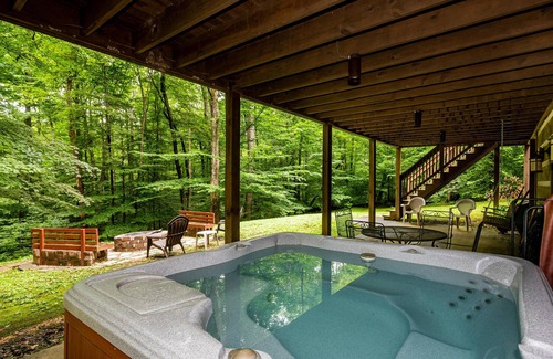 On the lower level of the cabin, a second bedroom with flat screen high definition satellite 27" TV and bath assures a quiet rest as you are tucked away in the Brown County woods. There is a sofa with pull out bed for extra guests. The family room area is set up for a grand time with a billiards battle, 27" high definition satellite TV, a Wii gaming system for family fun, and a selection of movies for your enjoyment. Another set of French doors leads to the patio where you will find a bubbling hot tub awaiting you...and, if you are lucky... a deer surprise.