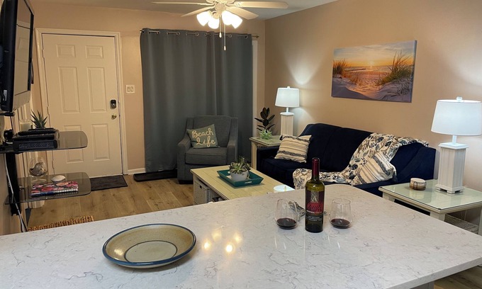 Relax and unwind as you walk into your private patio with a well-maintained hot tub and enter your end/bottom floor condo (only 4 deck steps) via keyless entry to the comfortable and bright living area furnished with a large couch with pull out queen bed, and Roku TV. The kitchen is fully stocked with pots/pans/utensils, coffee maker, blender for your daiquiris and oven/microwave/toaster for your cooking needs. A washer/dryer set is located right off the kitchen. All of the TVs have brand new Roku’s and free Wi-Fi so you can stream whatever streaming services you have. The primary bedroom has a king size bed and a TV with a full bathroom and has private sliders to the patio. The second bedroom has a queen bed and an attached full bathroom. Pack-n-play with extra fitted sheets, potty seat, clip on highchair are onsite ready for use for your little one. Family games and kid’s books/toys. There is an on-site inground outdoor pool. The private patio has an umbrella, table and chairs that are perfect for relaxing after a long day at the beach. It also offers plenty of space for all of your sandy beach gear. Best of all... an 11am CHECKOUT!