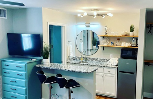 The second bedroom is a studio with its own separate front door and interior locking adjoining doors. It has a comfortable queen platform bed with a twin trundle bed beneath that can be rolled out to use. Another lavish floor to ceiling tiled shower with rainfall showerhead and dual handheld makes this second bedroom just as appealing as the primary. The kitchenette in the studio is equipped with a mini fridge with freezer, microwave, eletric water kettle, and another pour over coffee pot.