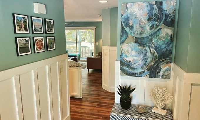 The entryway is decorated with local photography prints and coastal artwork from an East Coast artist. Upon entering, you have a view to the screened in back porch just beyond the comfortable living room and updated kitchen. The washer & dryer are located in a closet in the front entry for your convenience during your stay.