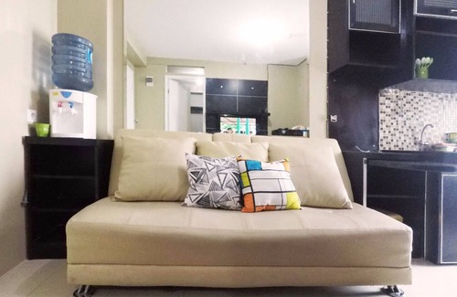 A cozy 2 Bedroom apartment on the 21th floor of Sakura Tower with a Homie interior design. The unit comes with televisions and 2 AC located in the bedrooms and the living room. It also has free access to a small shared gym with a pool* on the ground floor and a parking spot. As of now, pool only for monthly guest. It's placed comfortably above Kalibata city mall, a large shopping mall with many restaurants, a cinema, a gym, a supermarket, ATMs, and lively Restaurant and Cafe