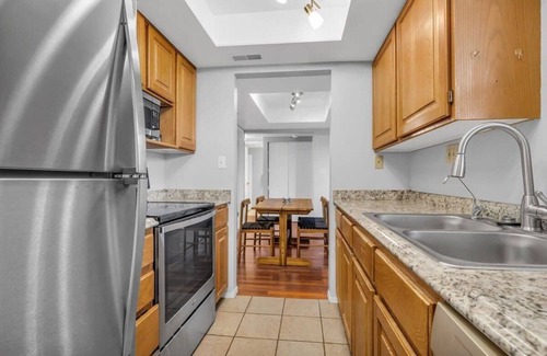 Tucked behind the living room is the dining area where you will find a wood table with seating for four underneath a box vault ceiling. The condo includes a few different board games and cards so once you have finished dinner you can turn the table into the game night area as you challenge the group to some friendly competition. Connected to the dining room is the kitchen making it convenient to stay connected to the group while you are preparing a meal. The fully equipped kitchen features everything you need to whip up a meal from stainless steel appliances, a full range of basic cookware, and even a crockpot and blender, you will enjoy preparing your delicious creations in this space! Connected to the end of the kitchen is a laundry nook where you will find a washer and dryer for guest use if needed.