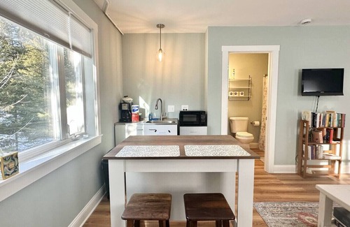 Deer Run was once a garage that has been renovated into a standalone home in Bar Harbor near the head of the island in Town Hill. The unit is setup as 2 Studio Apartments combined into 1 Unit. Each floor has a Queen Bed, Living Room, and Bathroom. The setup is perfect for 2 groups of people traveling together while still each having their own space!