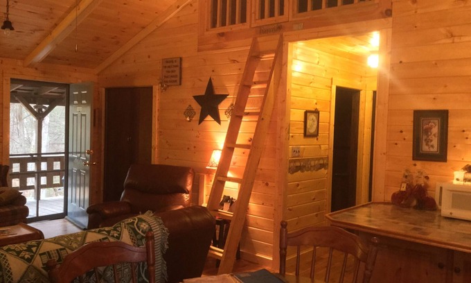 We have 2 bedrooms, ** AND A NEWLY ADDED LOFT!!!!**1 bathroom with newly installed bath tub, and an open living room with kitchen. Kitchen includes utensils, dishes and cookware. Come relax on our wrap around porch while swinging in our 2 porch swings. Enjoy the wildlife such as many birds, whitetail deer, wild turkey, squirrels and rabbits, which may be seen at any time.