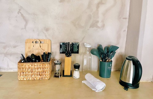 Complete kitchen with stove, oven, microwave, refrigerator, coffee maker, comprehensive cookware, and dinnerware. Prepare gourmet meals with local ingredients in your spacious penthouse kitchen.
